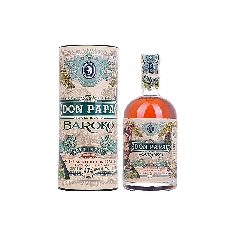 Il “Baroko” è un Rum figlio della rigogliosa e fertile terra delle filippine. La distilleria Don Papa si trova sull’isola di Negros e in una decina d’anni, ha saputo affermarsi come una delle più interessanti novità del panorama mondiale dei distillati. Alla base del Rum c’è una qualità di canna da zucchero tra le migliori al mondo, coltivata al clima ideale e su terreni ricchi di minerali, generati dal disfacimento lavico delle antiche sciare del vicino vulcano del Monte Kanloan. La canna viene tagliata e lavorata artigianalmente, in modo da estrarre una melassa fragrante e densa di dolcissimi aromi. Si procede quindi alla fermentazione della materia prima e alla successiva fase di distillazione, realizzata in alambicchi tradizionali in rame. Il ricco distillato matura a lungo in botti di rovere americano ad alta tostatura, precedentemente utilizzate per l’invecchiamento del Bourbon. Prima dell’imbottigliamento, si aggiunge al Rum un pizzico di zucchero di canna, per renderne il profilo più morbido e dolce.